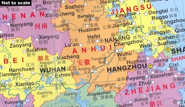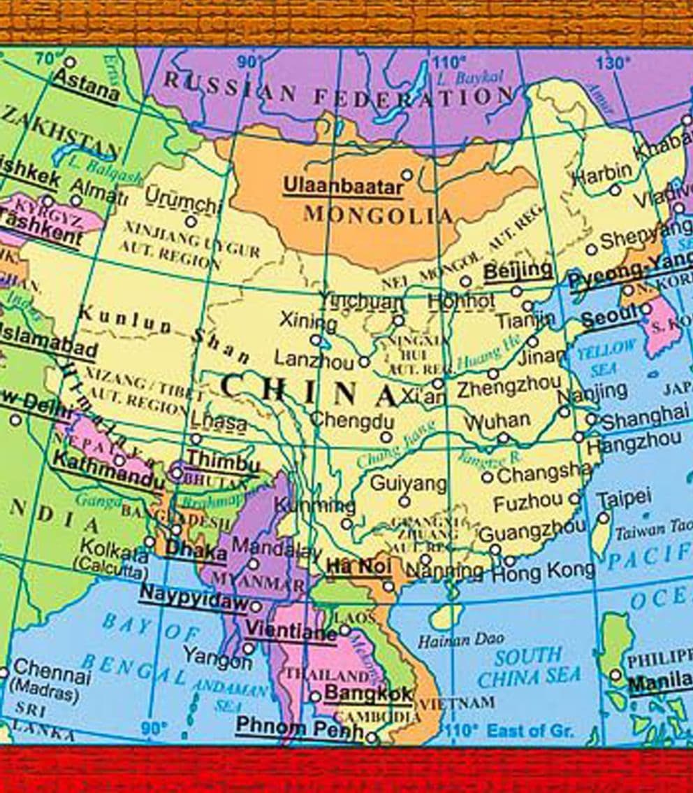 Chinas provinces are shown in bright contrasting colours. Town symbols indicate the size of the population. Main airports and ports are marked, as well as coastal and international shipping routes, Topographic information is limited to the network of rivers.