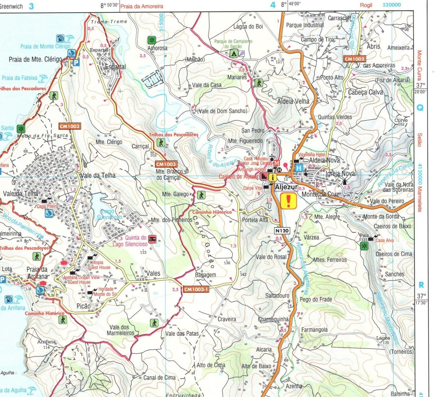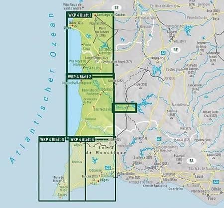 The set of 2 double-sided tourist maps “Costa Vicentina” shows the famous Portuguese long-distance hiking trail at a scale of 1:50 000. The entire region around the picturesque Rota Vicentina is detailed on 4 sheets. Hikers will find all the important information they need to walk the fisherman’s path and the historical path in whole or in stages.
