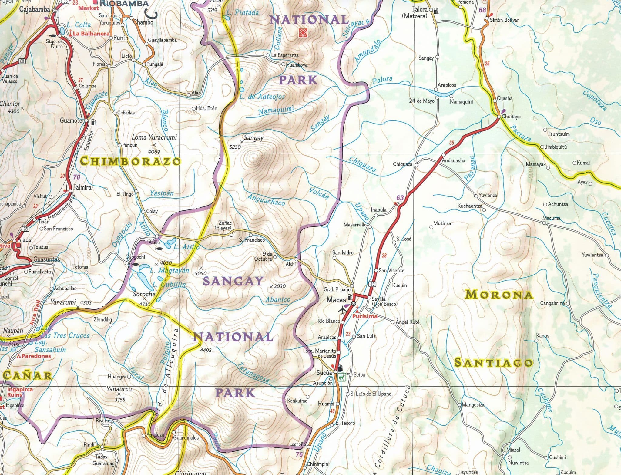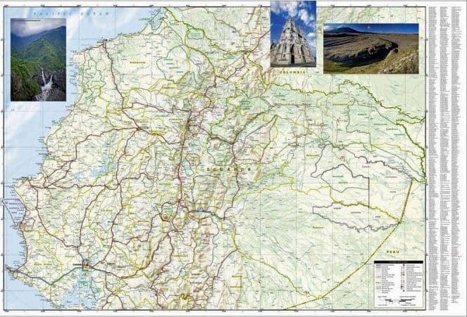National Geographic's Ecuador and Galapagos Islands Adventure Map, with its comprehensive information, is uniquely designed for adventure travellers. The map delivers unparalleled detail of the entire country and its recreational, historical, cultural and natural destinations. Pinpointed spots include beaches, wildlife areas, archaeological sites, churches and areas for camping, surfing, fishing and diving. A list of cities and towns with a user-friendly index is provided along with a road network of highways, major and secondary roads, shown with distances. Unsurfaced and 4-wheel-drive roads are mapped for those wishing to get off the beaten track. Other displayed travel aids include airports, airfields, harbours, anchorage sites, railroads, ferry routes and border crossings with neighbouring Colombia and Peru.