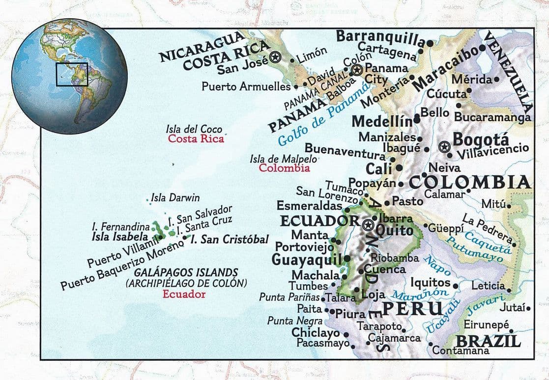 The northern part of the map covers the capital city of Quito, Cotopaxi Volcano and National Park, Cuyabeno Wildlife Reserve, the town of Tena in the Amazon rainforest and the country's largest city of Guayaquil. The southern part of the map covers from Guayaquil to the southern and southeastern border with Peru, showing the diverse Podocarpus National Park in the southern Andes and Amazonian ecological systems. An inset map covers the world renowned Galapagos Islands, showing Galapagos National Park and Marine Reserve, Tortoise Reserve and diving areas around the islands. This expertly researched map is the perfect complement to any guidebook.