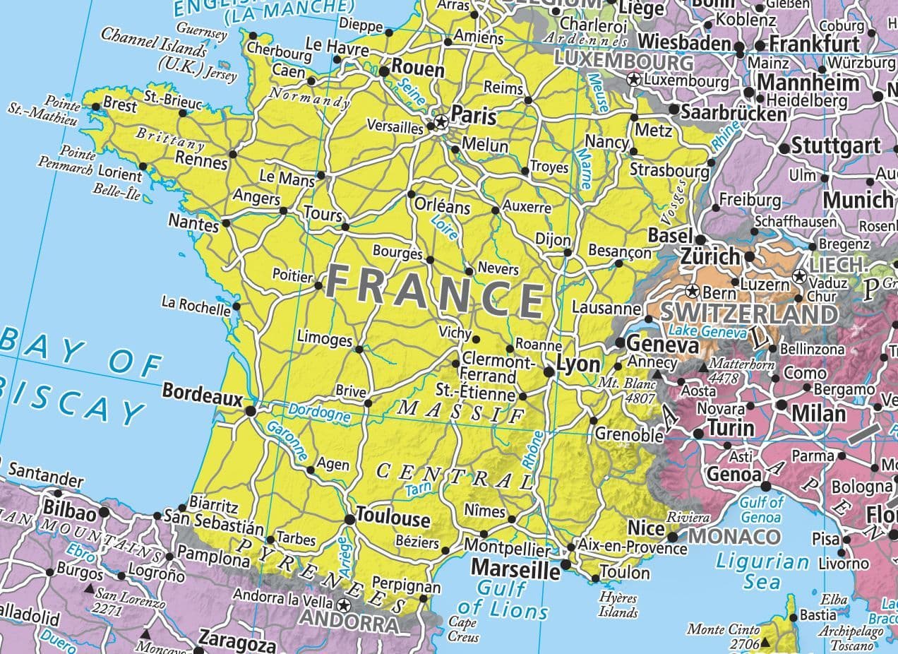 New and up-to-date, this Map shows all the countries that make up the continent. Stretching from the Atlantic Ocean in the west to Arctic Circle and beyond, to the Ural Mountains and the Mediterranean Sea.