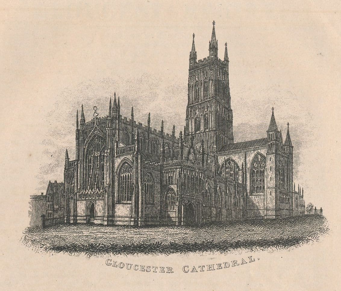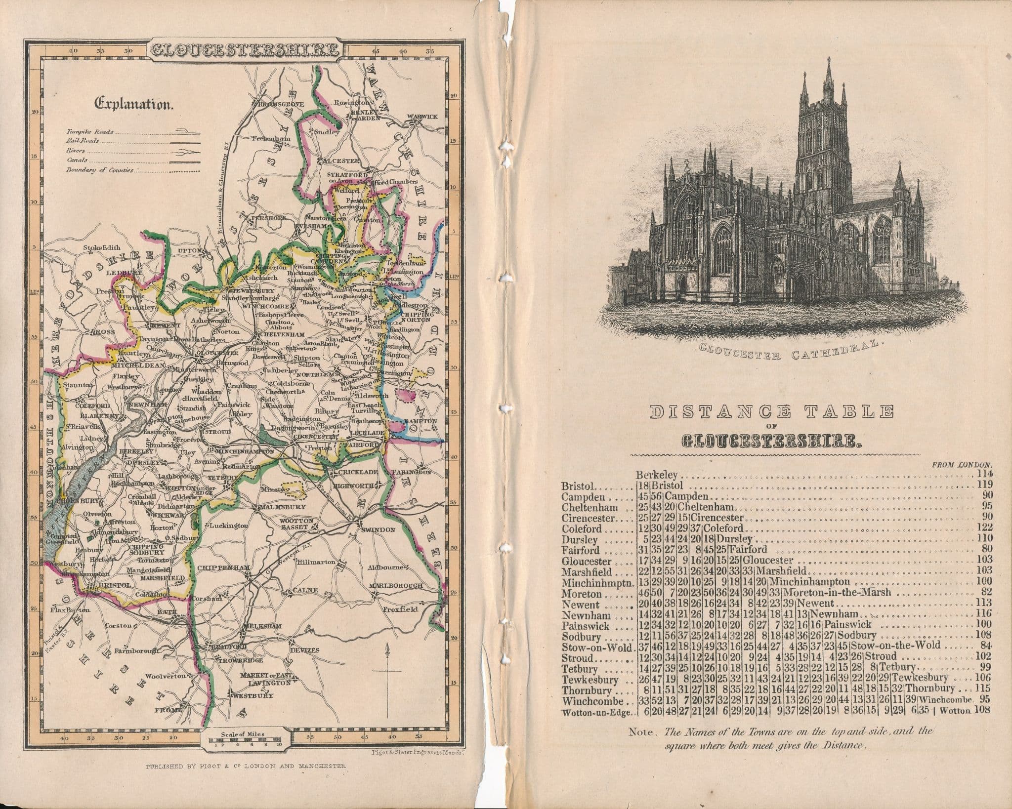 The Map sits beside a Distance Table and engraved image of Gloucester Cathedral
