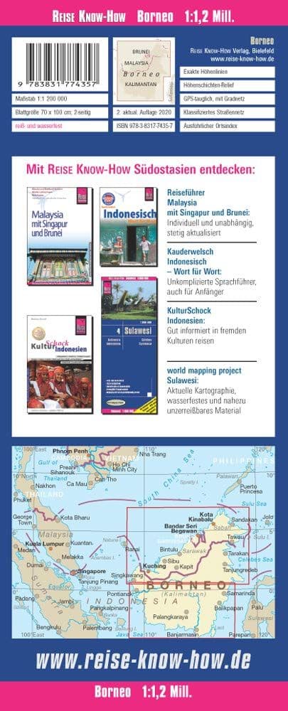 The map is double-sided to provide the best balance between a good scale and a convenient size sheet. On one side are the Malaysian provinces of Sarawak and Sabah, Brunei, plus the northern part of Indonesian Kalimantan, with the rest of Kalimantan on the reverse.