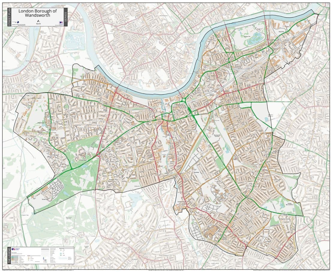 This wall map shows the outline of the London Borough in black and to highlight the Borough fades the map detail beyond.