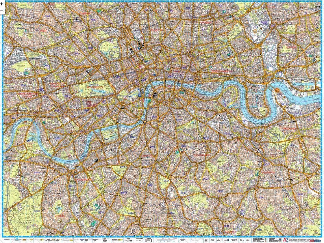 A wall map showing all the streets of the city. Using the iconic A-Z mapping, this gives an overview of the city down to Street level.
