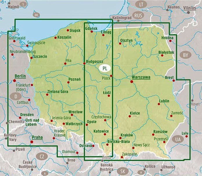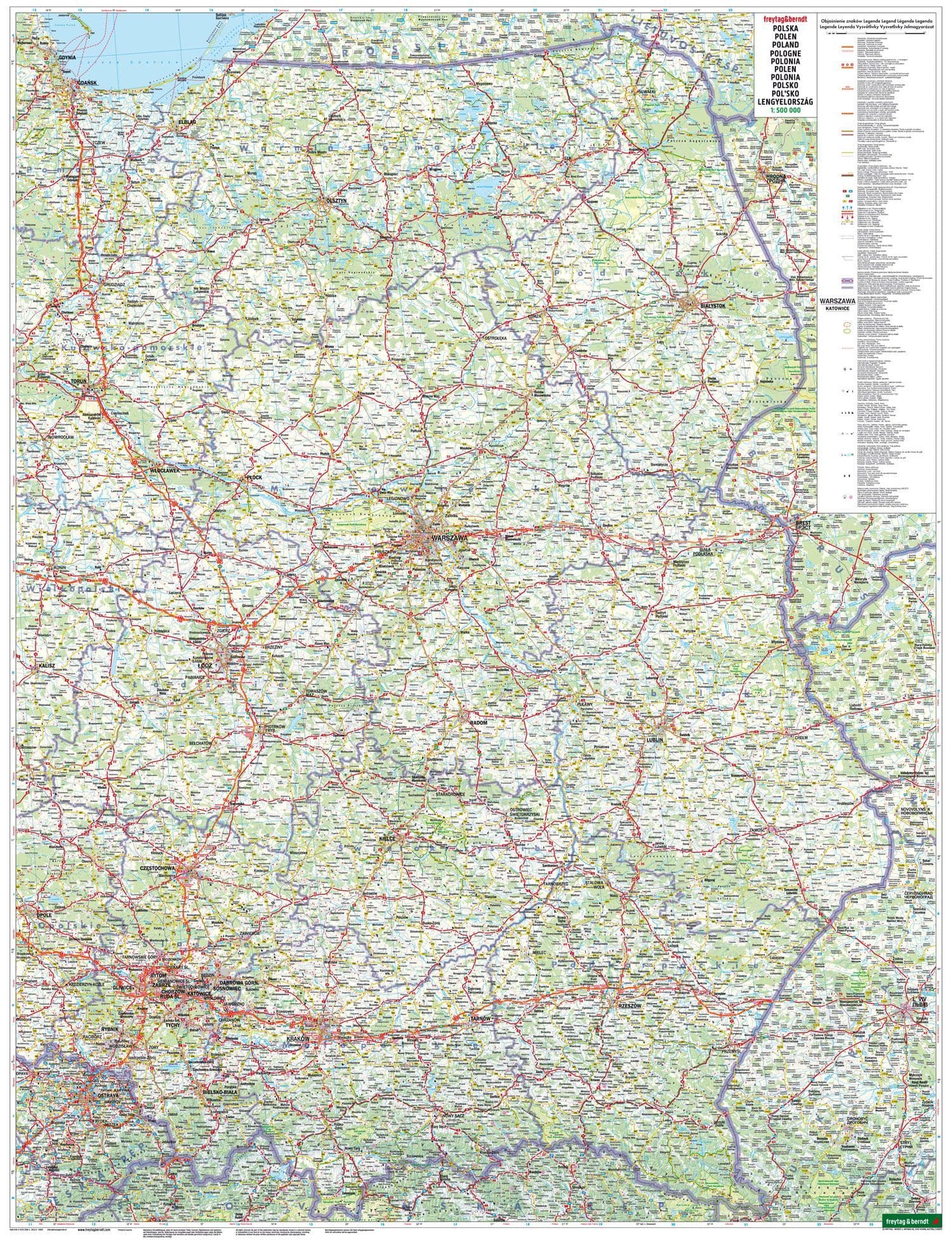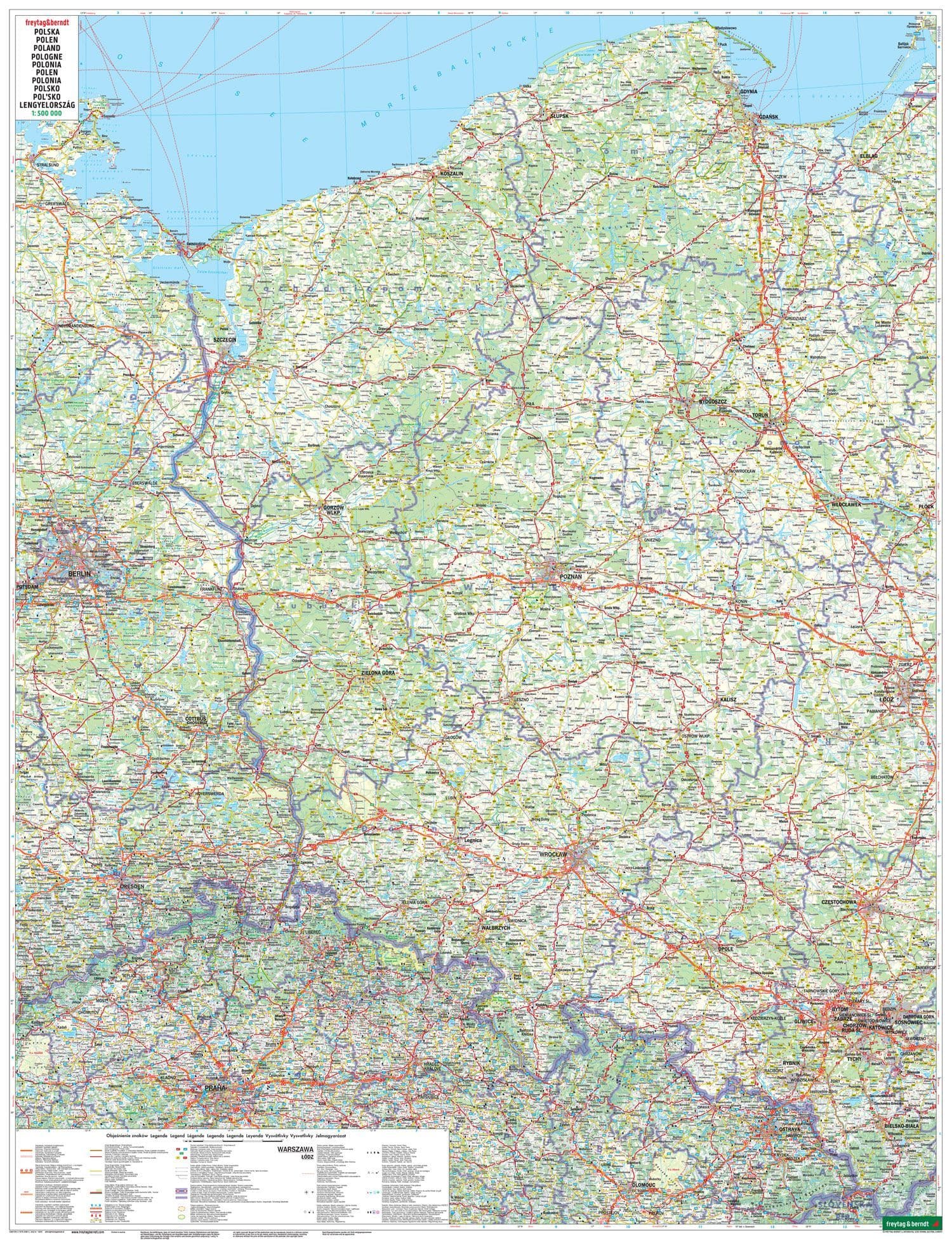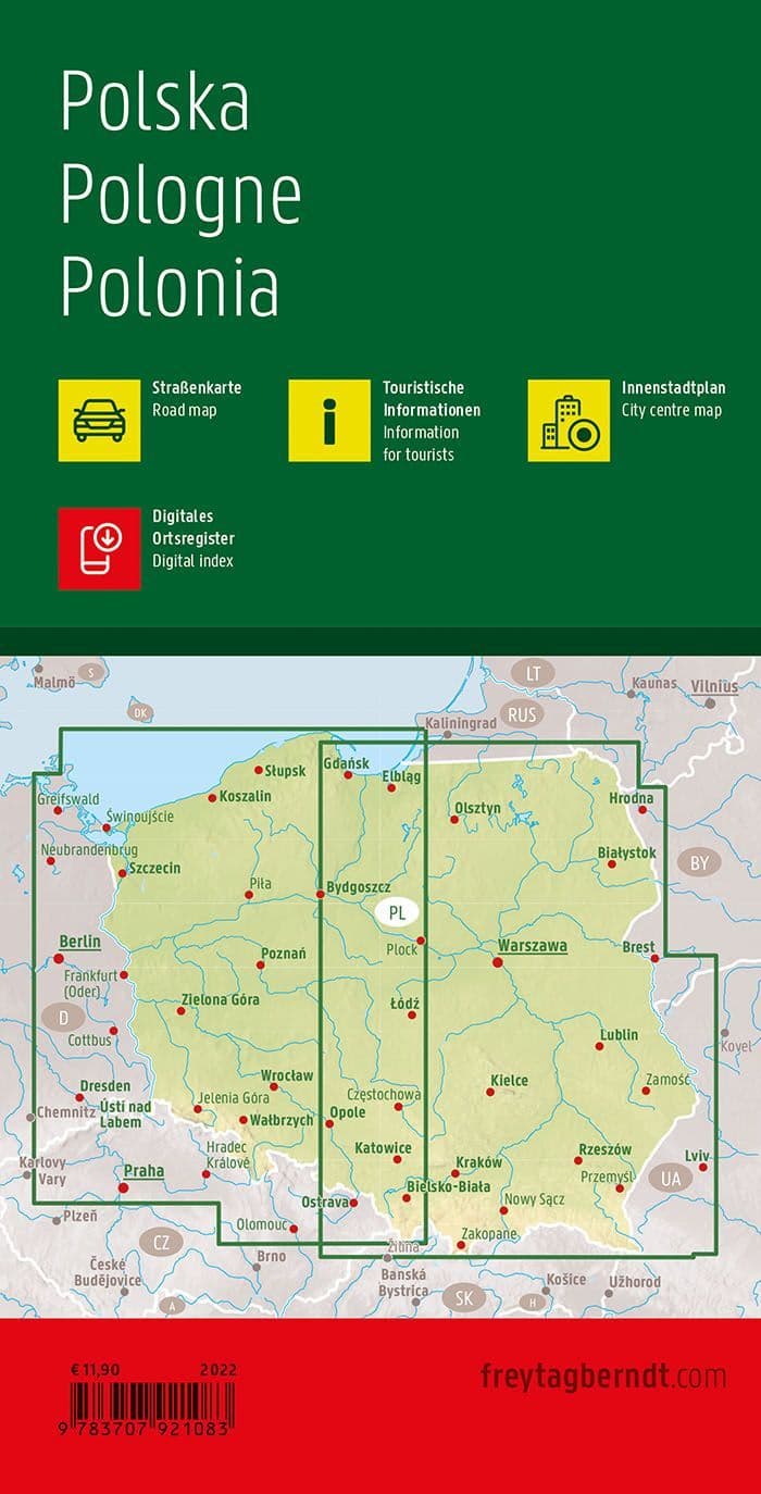 The road map of Poland at 1:500,000 contains a lot of information that is useful for a trip to the Central European country. The road and rail network is shown and excursion destinations that are particularly worth seeing - including castles, palaces and ruins - are highlighted.
