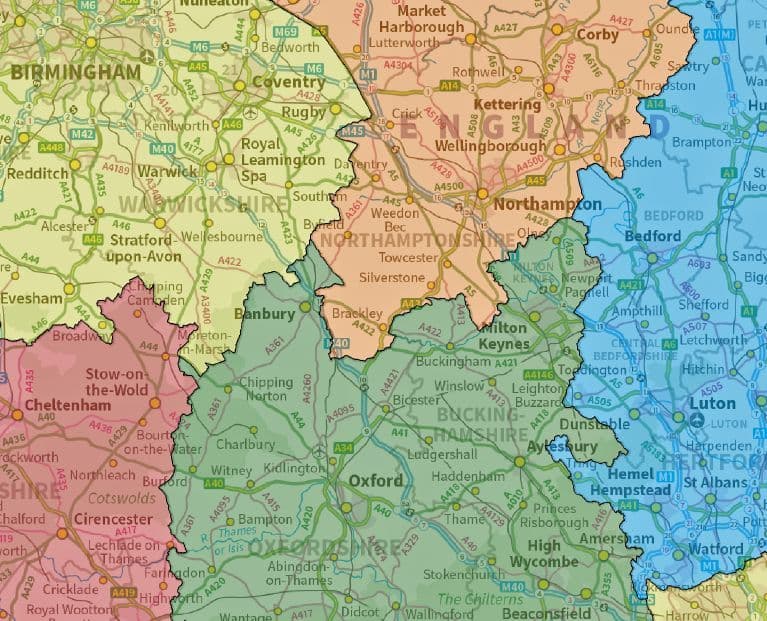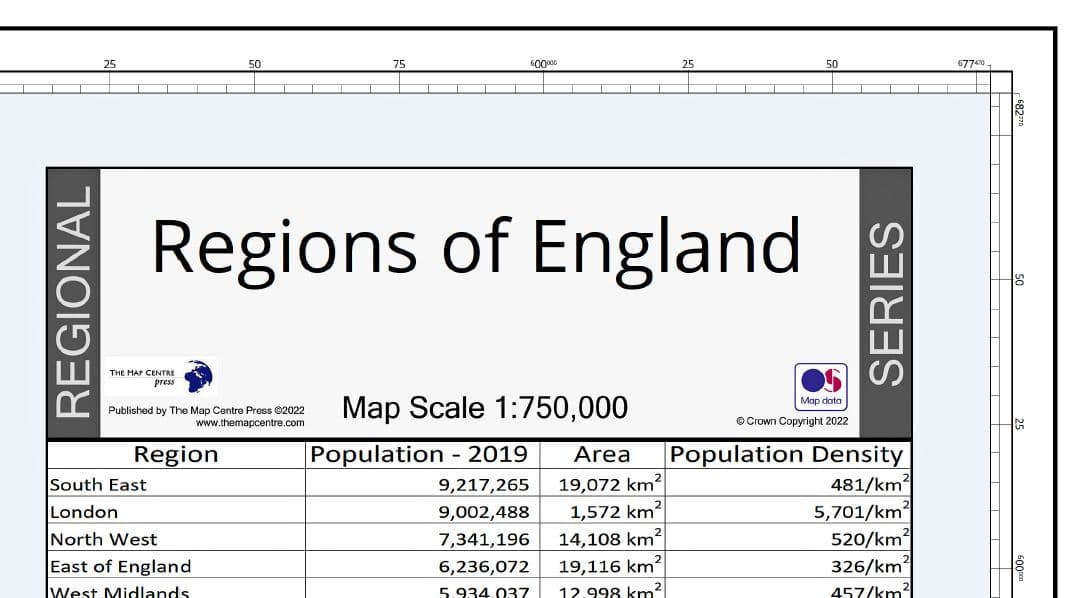 A rolled wall map of England depicting all 9 regions of England on a single sheet.