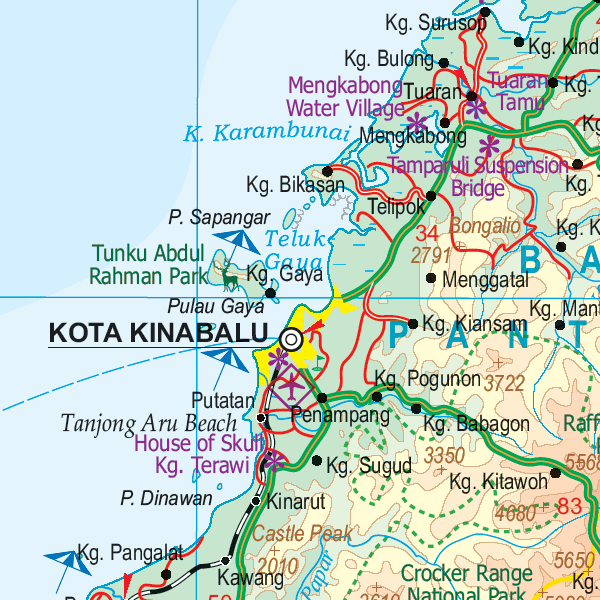 Sabah and Brunei are on one side with a place name index and an inset map of the Kota Kinabalu Centre and a Mount Kinabalu Trail map.