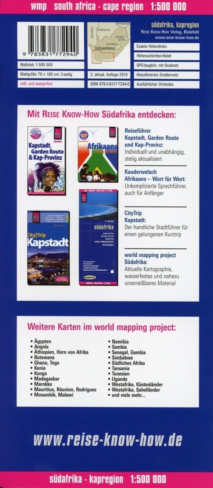 Cape Region of South Africa, including the whole of the Garden Route, at 1:500,000 on a light, waterproof and tear-resistant, indexed road map with a street plan of Cape Town and a map of the Cape Peninsula, published by Reise Know-How as part of their highly acclaimed World Mapping Project.
