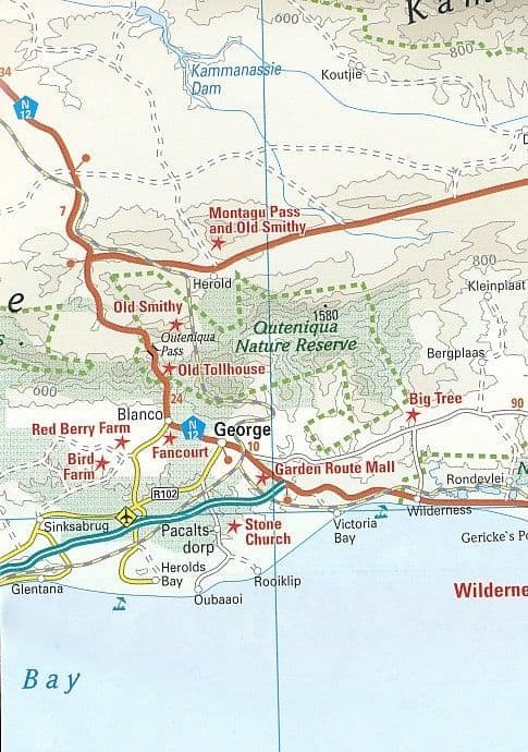 The map is double-sided to provide the best balance between a good scale and a convenient size sheet, and divides the region east/west. On the western part coverage within the Western Cape Province extends north along the Atlantic coast to just beyond Bitterfontein and 31° latitude, and includes part of the Northern Cape Province with the Hantamdberg, Roggeveldberge and Komsberge mountains and the Tankwa-Karoo National Park. The eastern half of the map extends beyond Port Elizabeth to Grahamstown and inland to Karoo National Park and Camdeboo NP and Mountain Zebra NP.