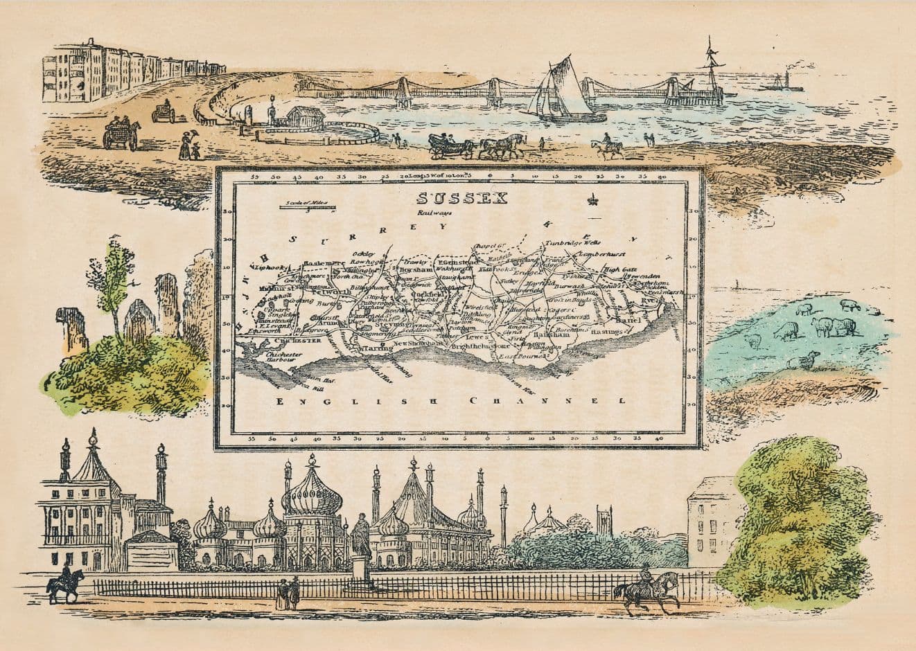 This is a Modern Reproduction A3 County Map with surrounding Vignettes.