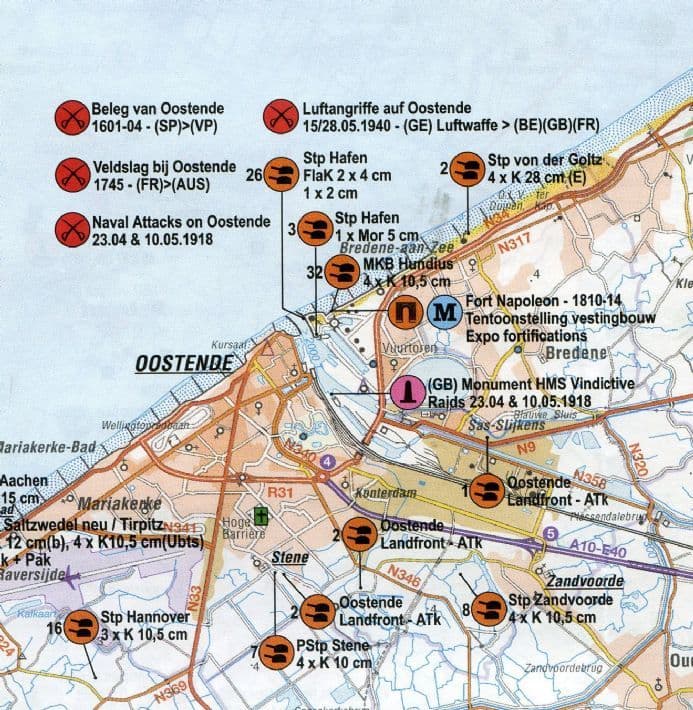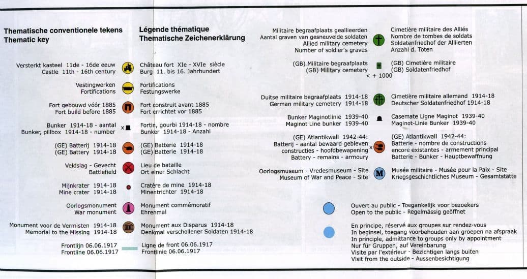 Sites in France in the immediate vicinity of the Belgian border are also marked. The overprint also indicates battlefields and fortifications from other periods of history of Flanders, from the Middle Ages to WWII.