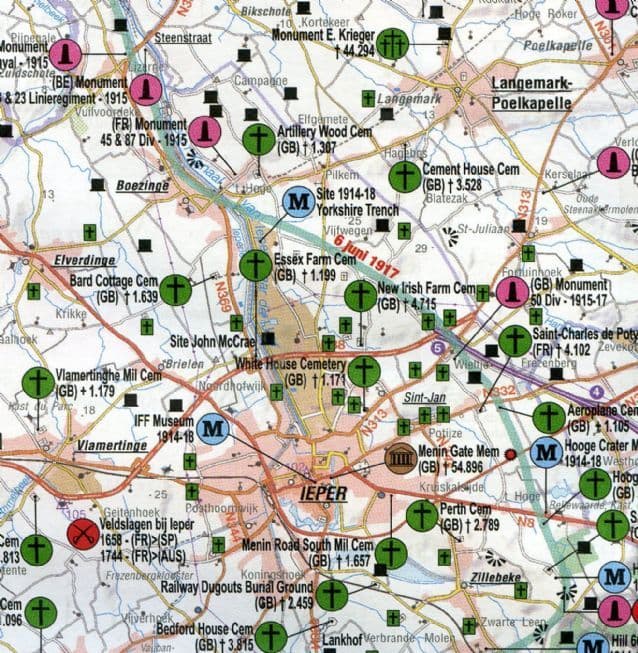 Includes a basic street plan of Ypres/Ieper, highlights locations of 22 conflict-related sites including the Menin Gate and the Commonwealth War Graves Commission.
