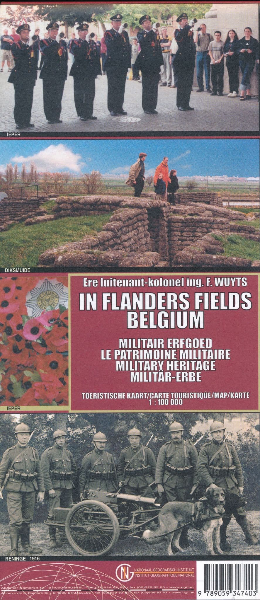 A detailed map at 1:100,000 from the Belgian Nationaal Geografisch Instituut (NGI) highlighting locations of numerous monuments, cemeteries, front lines and other World War One (WW1) related sites, listed and includes, where appropriate, their phone numbers.