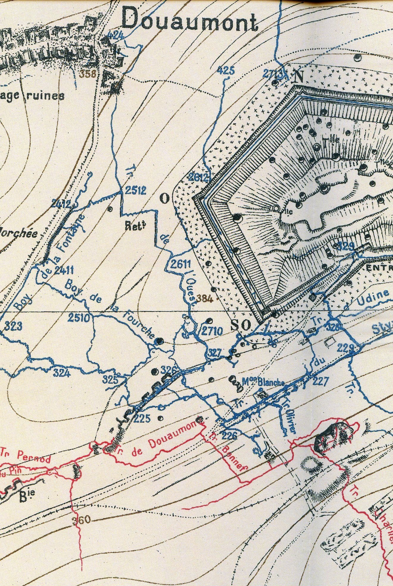 A reproduction of a contemporary map showing the area around the Fort de Douaumont at 1:5,000